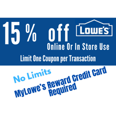 One-time 15% discount on your MyLowe’s Reward Card purchase. To qualify for this offer, you use a MyLowe’s Reward Card and make a purchase. The Coupon Cannot be used in conjunction with: any other coupon/bar code; Lowe’s Military Discount; Lowe’s employee discount; Lowe’s low price guarantee; Lowe’s volume or special discount programs; manager discretion price adjustments; Contractor Packs™; extended protection/replacement plans; shipping, delivery, assembly or installation charges; purchase or order with installation service not made at a Lowe’s store; fees or taxes; gift cards; previous sales; THOR, NXR, AGA, MARVEL, Bosch Benchmark, Heartland, Fisher & Paykel, Monogram, SMEG or Liebherr appliances (some brands not available in all markets/stores); or Weber or Kichler products. The coupon has no implied warranties, is not redeemable for cash and is non-transferable. Customers must pay applicable sales tax. Void if altered, defaced, copied, transferred or sold through any online auction or otherwise. Excludes Lowe’s Business Credit accounts, Lowe’s Visa® accounts and all Lowe’s Canada Credit accounts. We reserve the right to discontinue or alter these terms at any time.